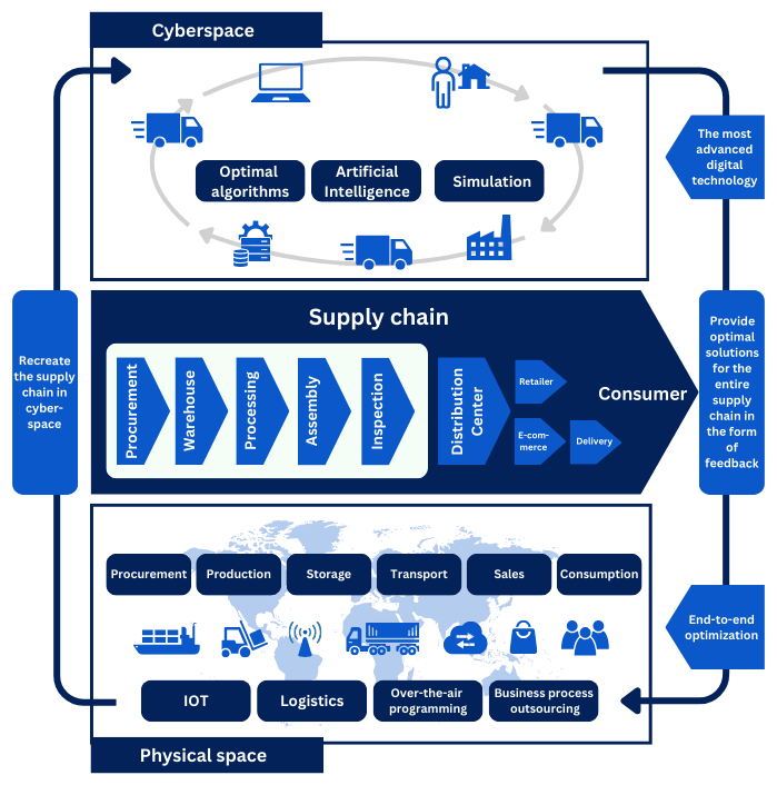 AI algorithms in cyberspace operate in conjunction with simulation models to create a digital twin of the physical supply chain. This enables complex optimization processes to be carried out, allowing for the prediction of outcomes and the streamlining of logistics operations.