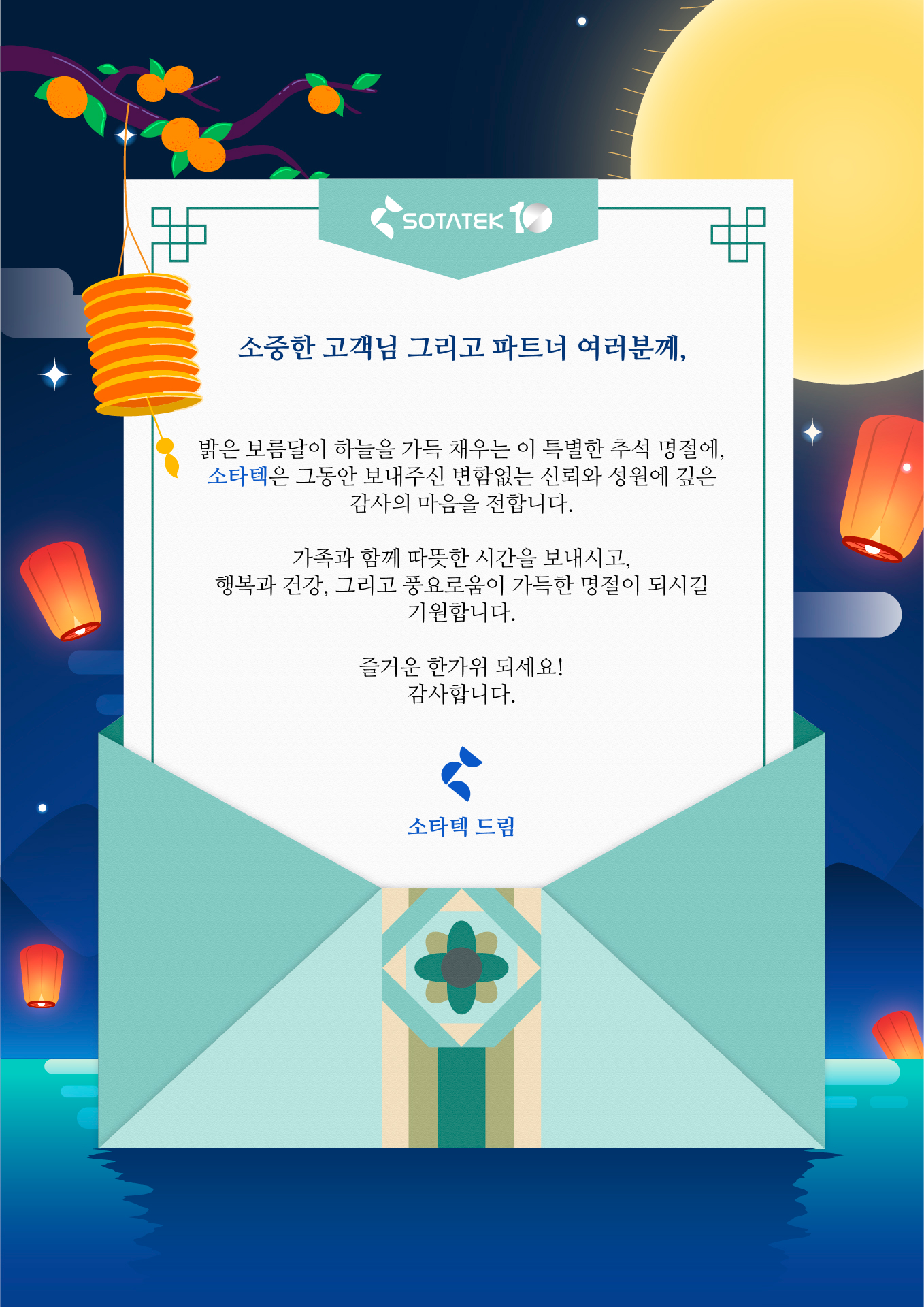 소타텍 코리아는 임직원, 파트너, 고객 여러분 모두가 사랑하는 이들과 함께 따뜻하고 풍성한 한가위를 보내시길 진심으로 기원합니다.