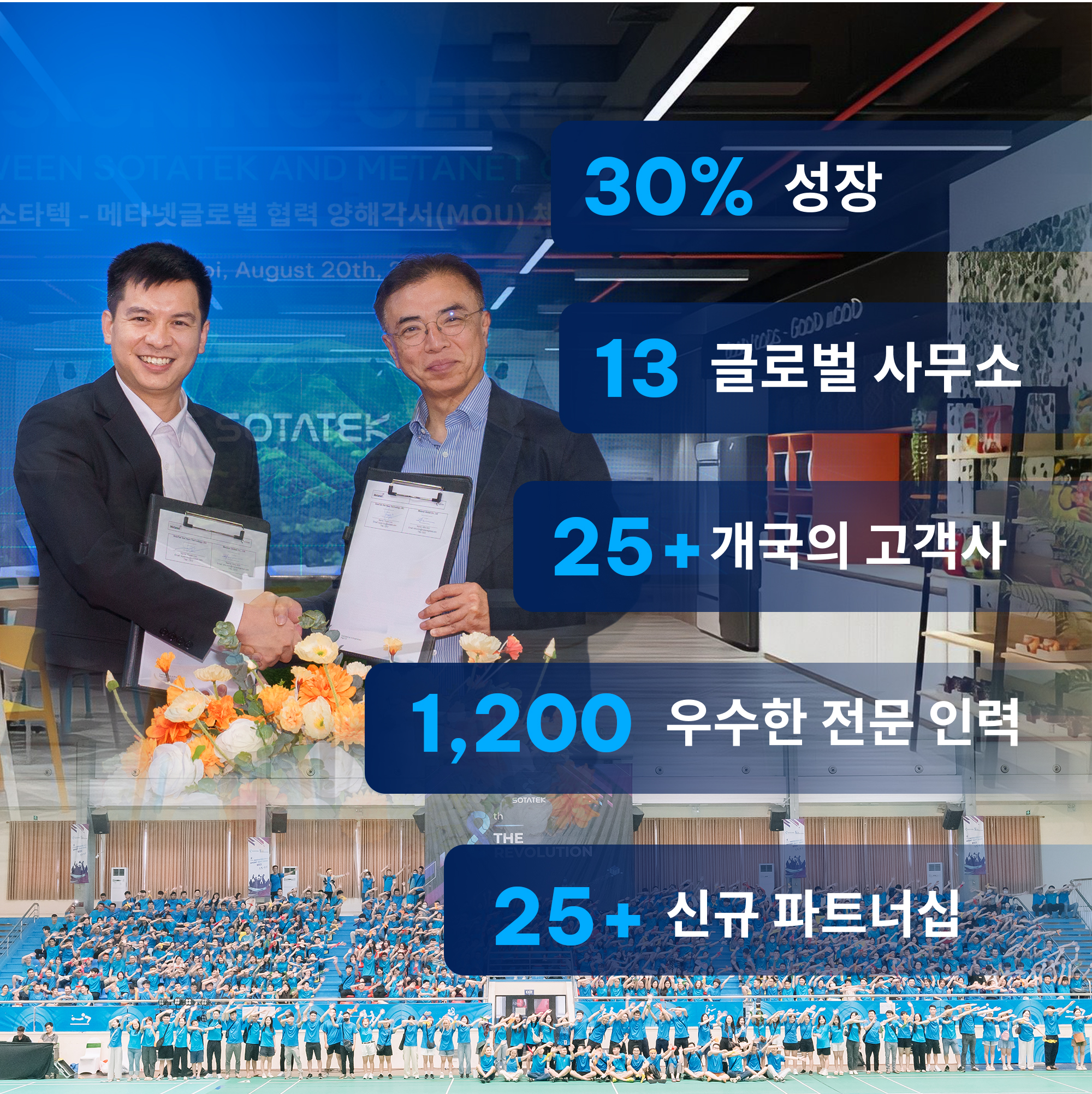 2024년은 SotaTek에게 있어 의미 있는 도약의 해였습니다. 우리는 전년 대비 30%라는 놀라운 성장률을 달성하며, 치열한 산업 환경 속에서도 우리의 회복력과 적응력을 입증했습니다.