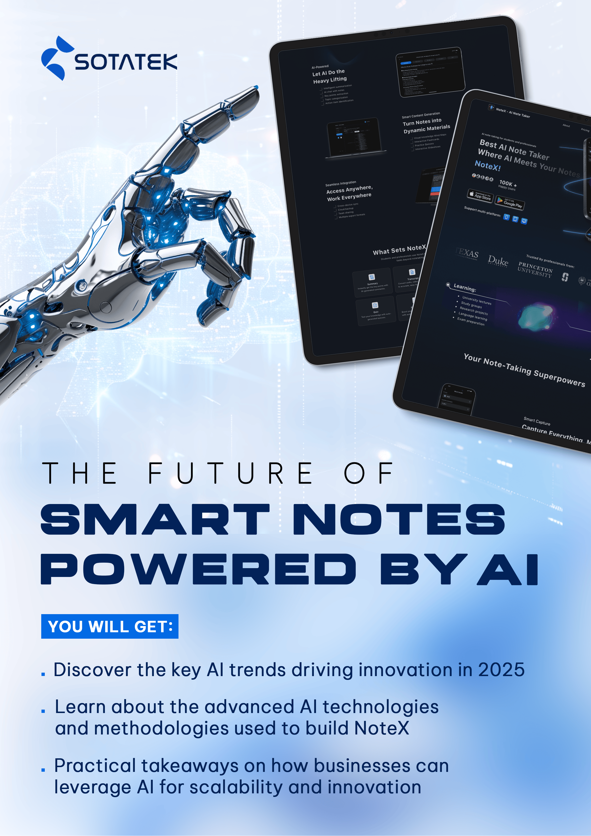 Enter NoteX, a smart note-taking solution that uses AI to organize information, improve search accuracy, and streamline workflows. This whitepaper explores how NoteX makes everyday tasks easier with AI while showcasing SotaTek’s expertise in AI-powered solutions.